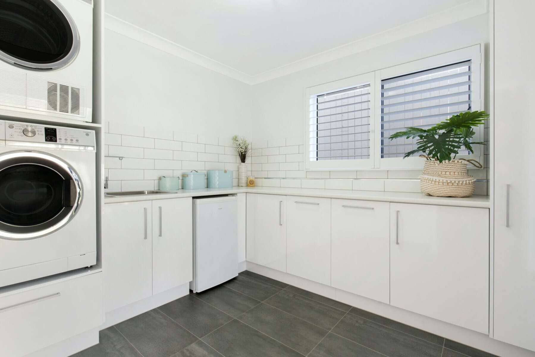 Pintu kaca yang dipasang rata dengan panel depan kulkas dan lemari lainnya membuka ke lemari penyimpanan “walk-in” seluas 36 kaki persegi (3,3 meter persegi) yang dilapisi dengan panel kayu ash beralur custom. Jendela di dalam lemari membiarkan cahaya masuk.
